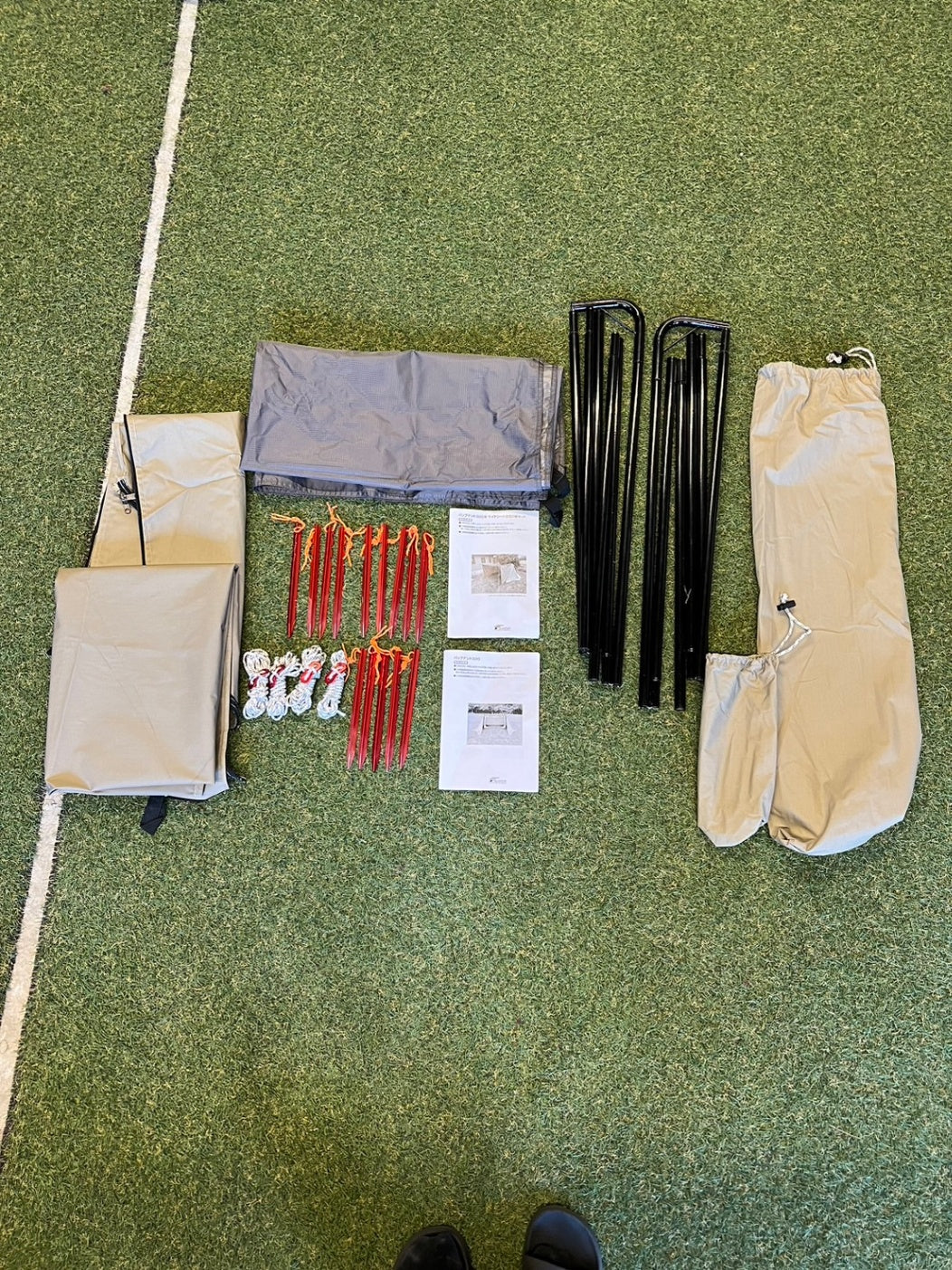 付属品 本体ポール2本、ポールケース、アルミペグ14本、ロープ4本、ペグケース、左右サイドシート、グランドシート、説明書。※跳ね上げ時のポール2本、ロープは付属しません。