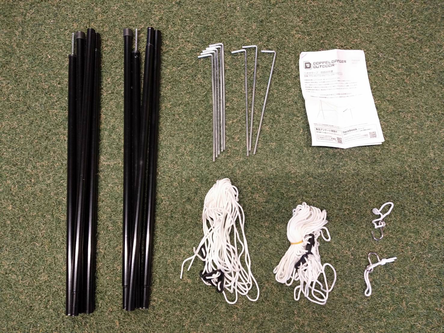 accessory | 組み立て式ポール×2、張り縄(長×4、短×4)、ペグ×8、ランタンフック×2、取扱説明書あり |