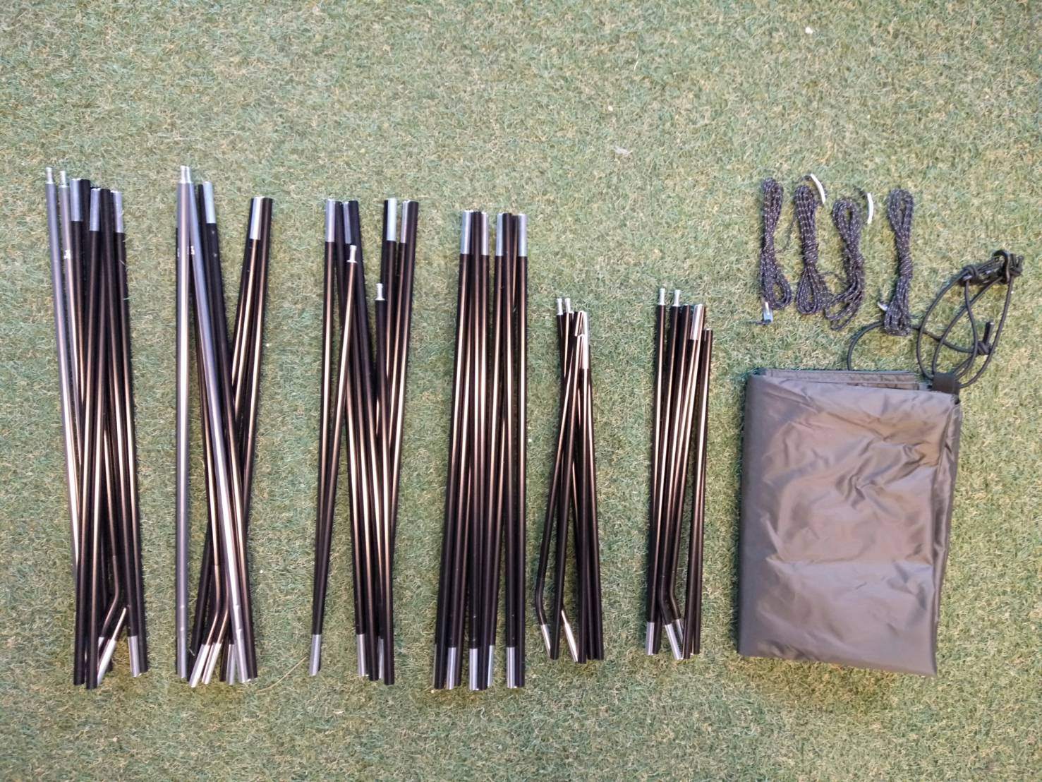 accessory Flysheet, inner tent, 2 bridge frames, 4 frames (2 long, 2 short), footprint, 12 2.5m guy ropes (included with tent), 4 1.5m guy ropes, no pegs, no instruction manual, storage bag