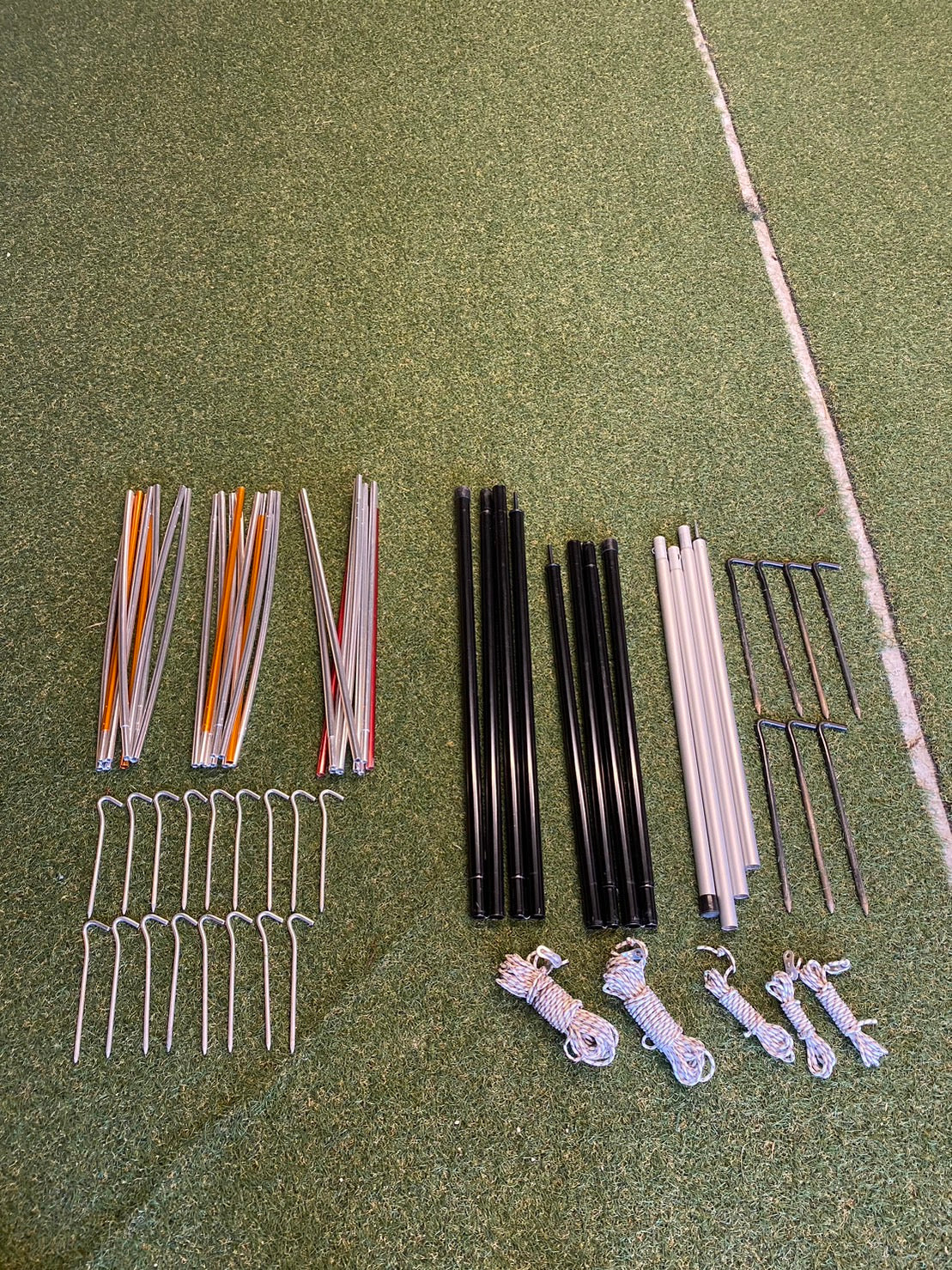 accessory | Tent main frame x 3, rope x 12 (all included with tent), pegs x 17 (stored in plastic bag without storage bag) / Tarp poles x 2 (long x 1, short x 1), other poles x 1, pegs x 7, rope x 5 (long x 2, short x 3), connecting belt x 1 |