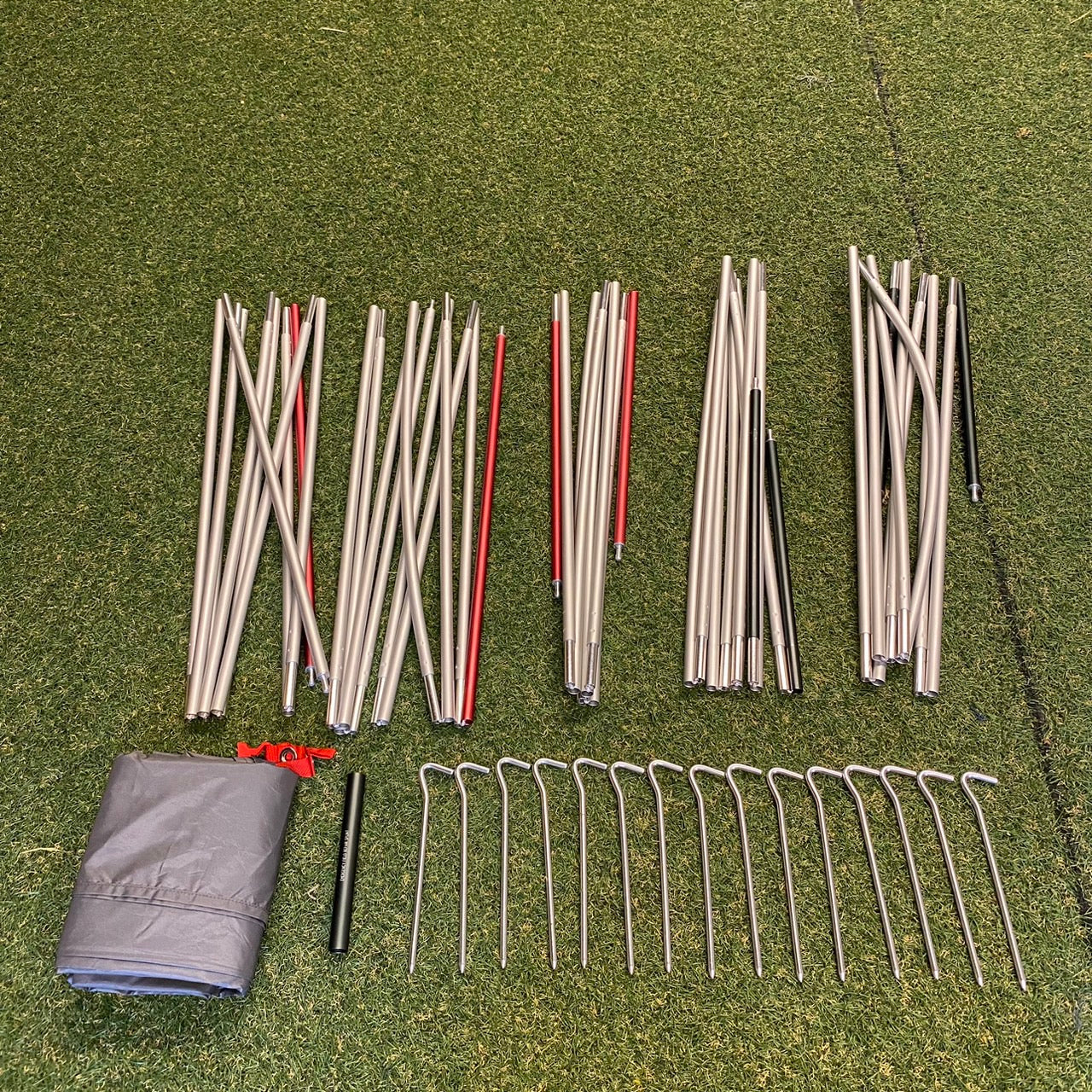 accessory | ポール×5、リペアパイプ×1、ペグ×15、グランドシート×1、ロープ×10(全てテントに付属) |