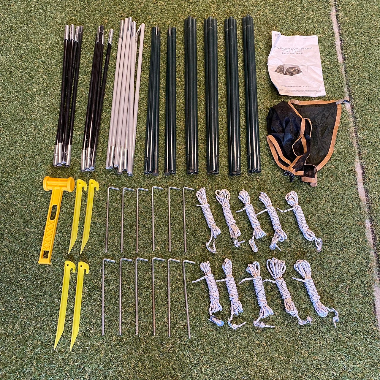 accessory ルーフポール×2、コーナーポール×4、フロントポール×1、キャノピーポール×2、ハンマー×1、プラペグ×4、スチールペグ×12、ロープ×10、ギアハンモック×1、説明書×1