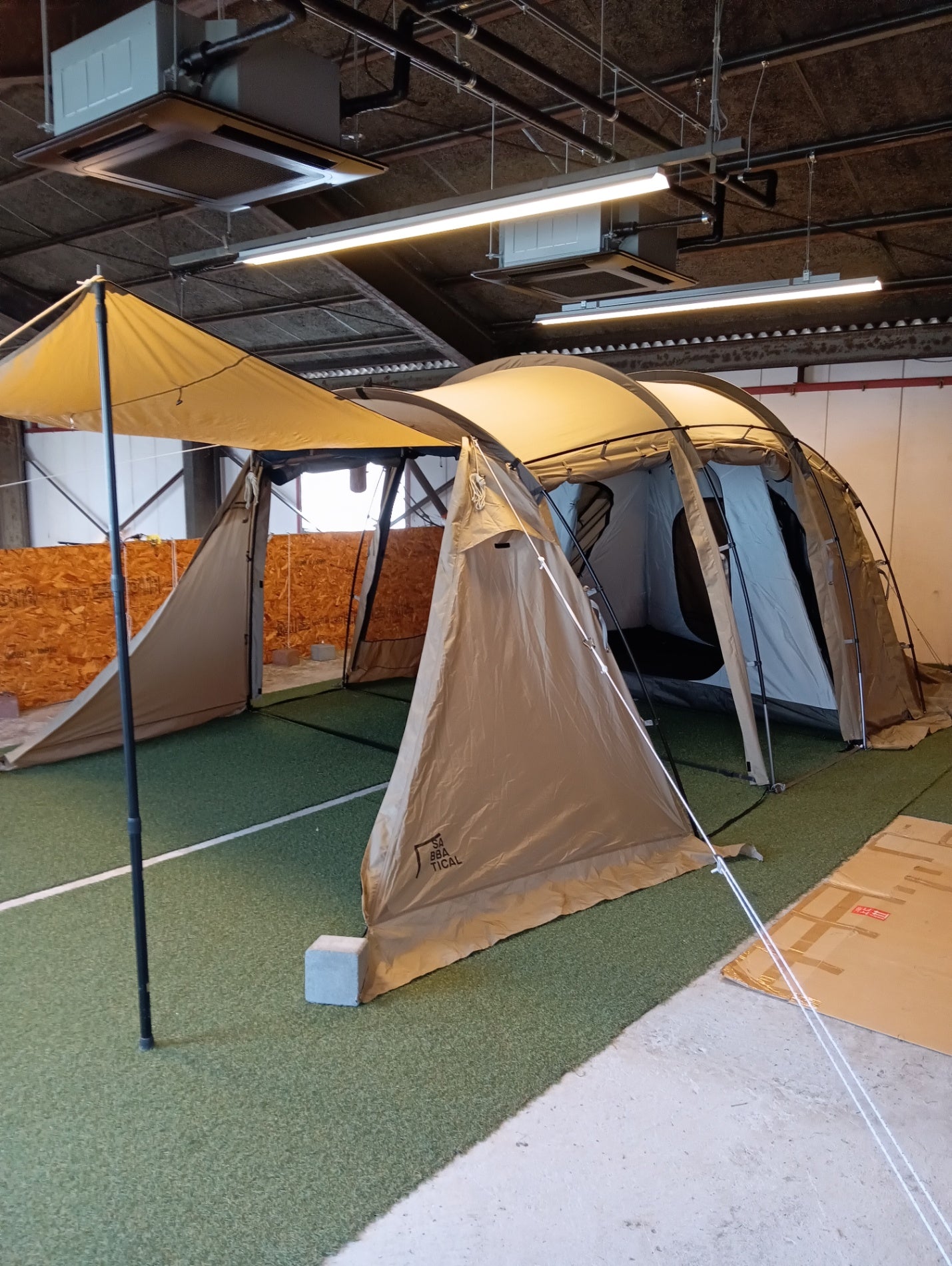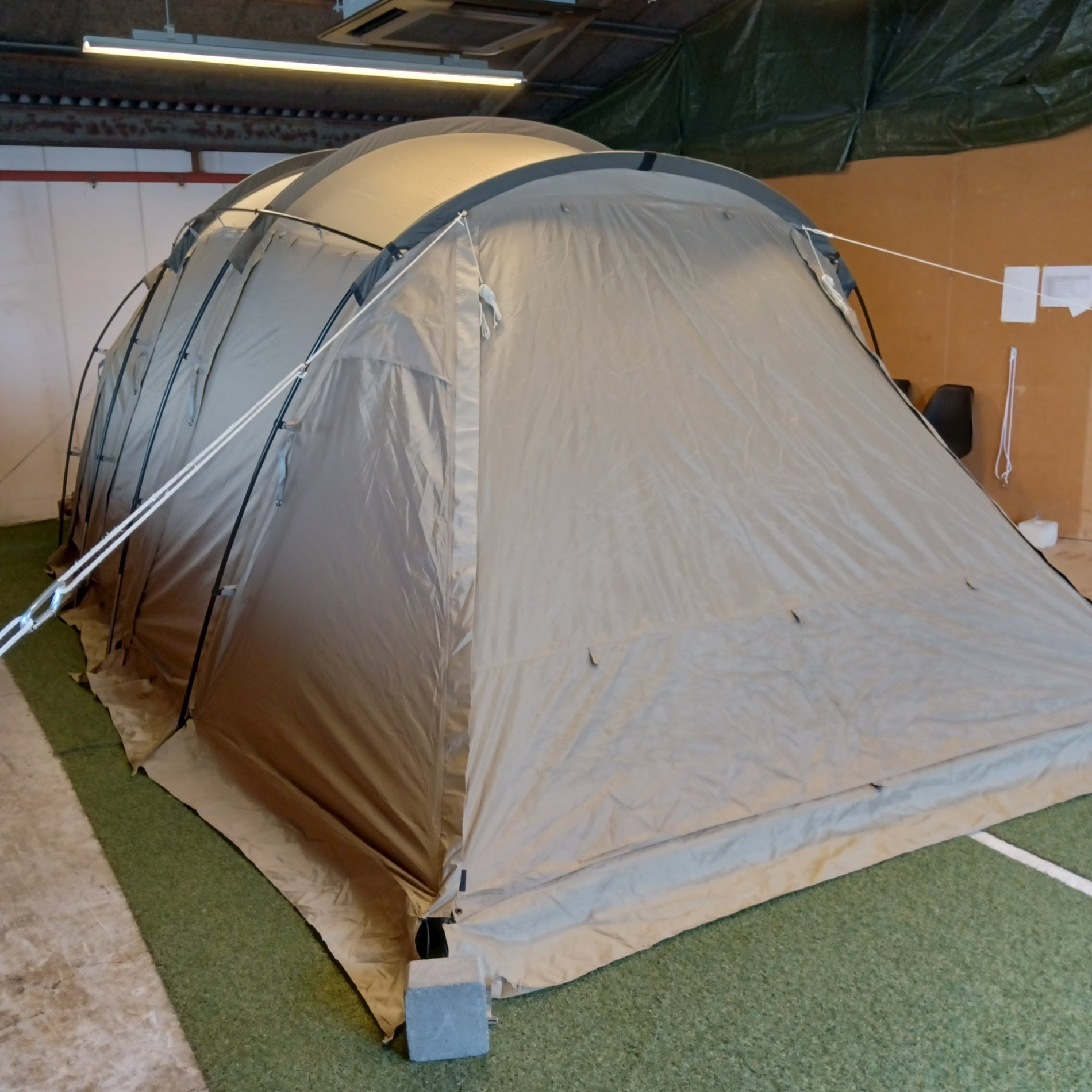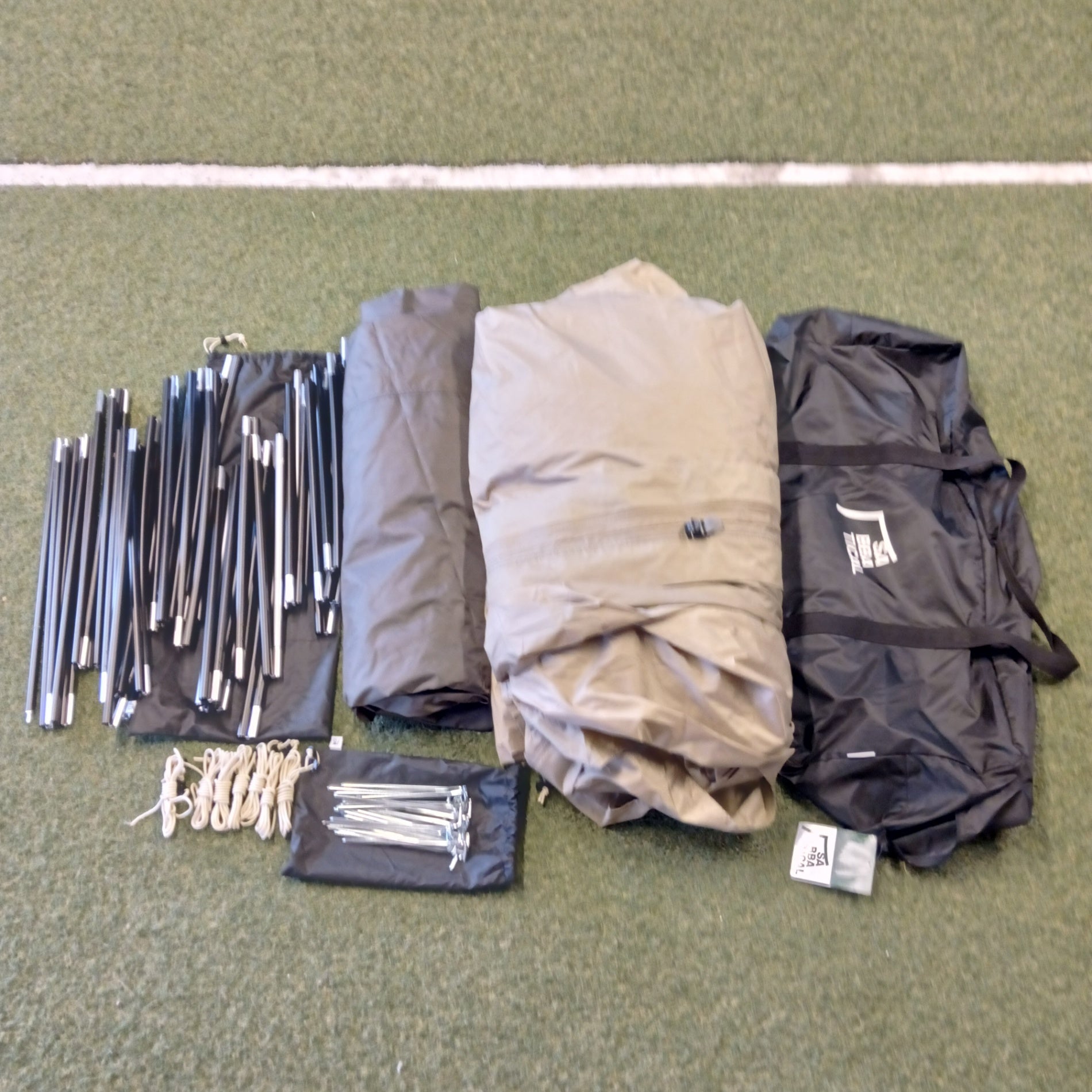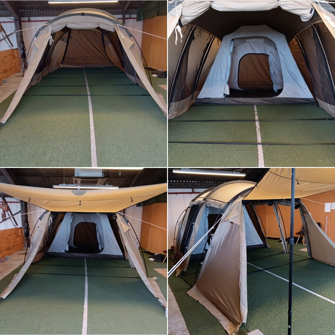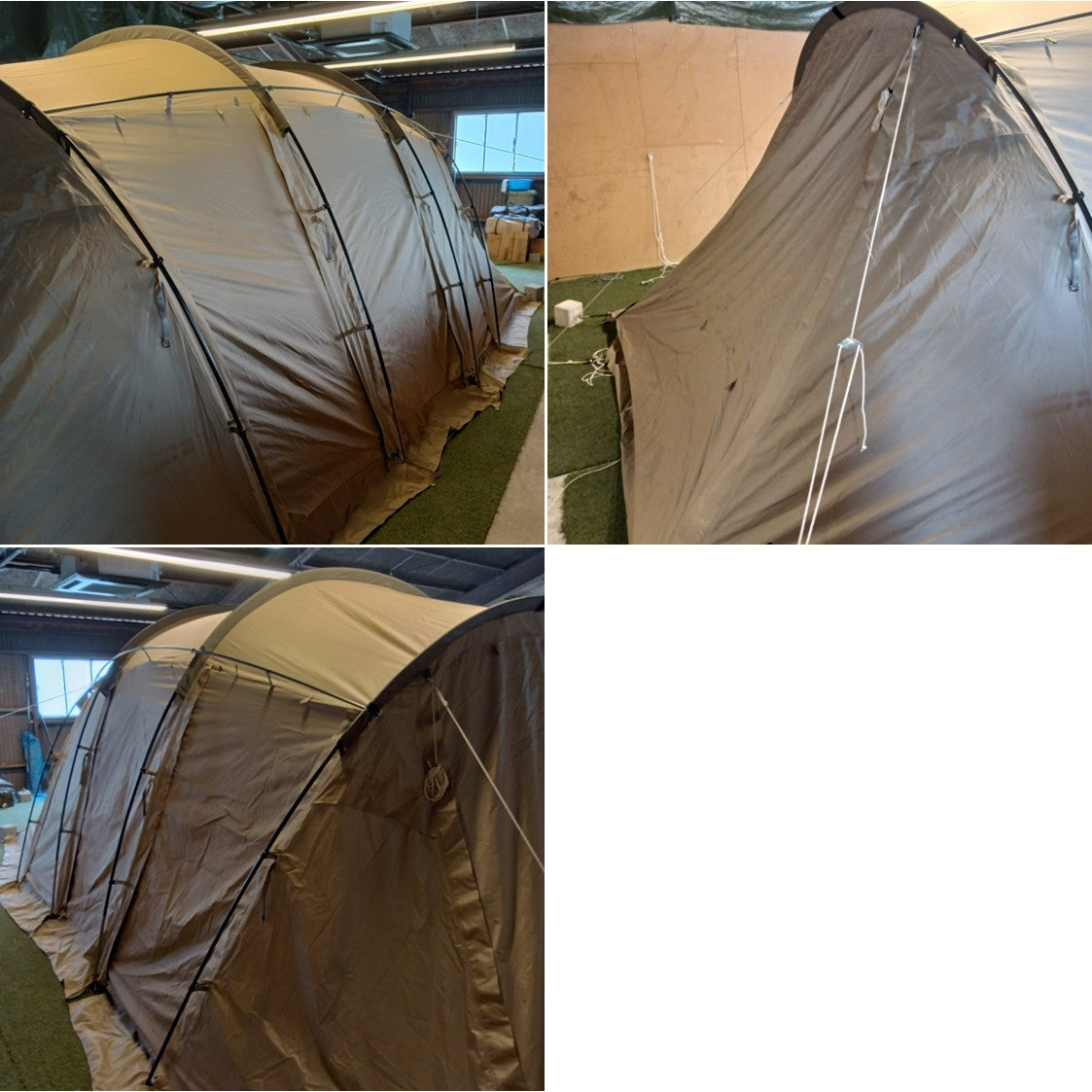 〇セット内容:フライシート(本体)、インナーテント、ポール×6(メインポール長×2、メインポール短×2、ブリッジポール×2)、ロープ×11(うち4本は本体に取付済)、ペグ×24、収納袋×2(ポール、ペグ)、キャリーバッグ
