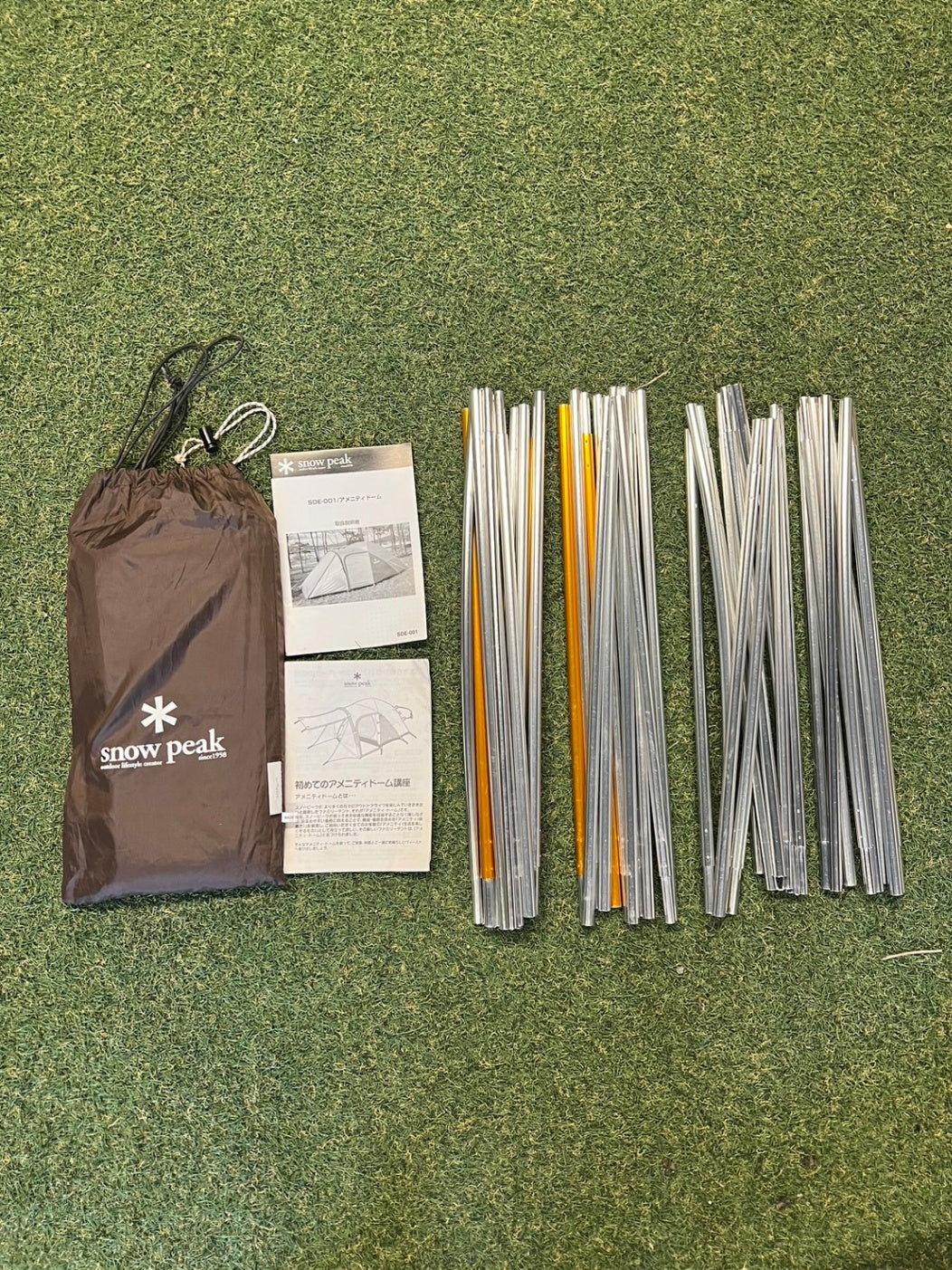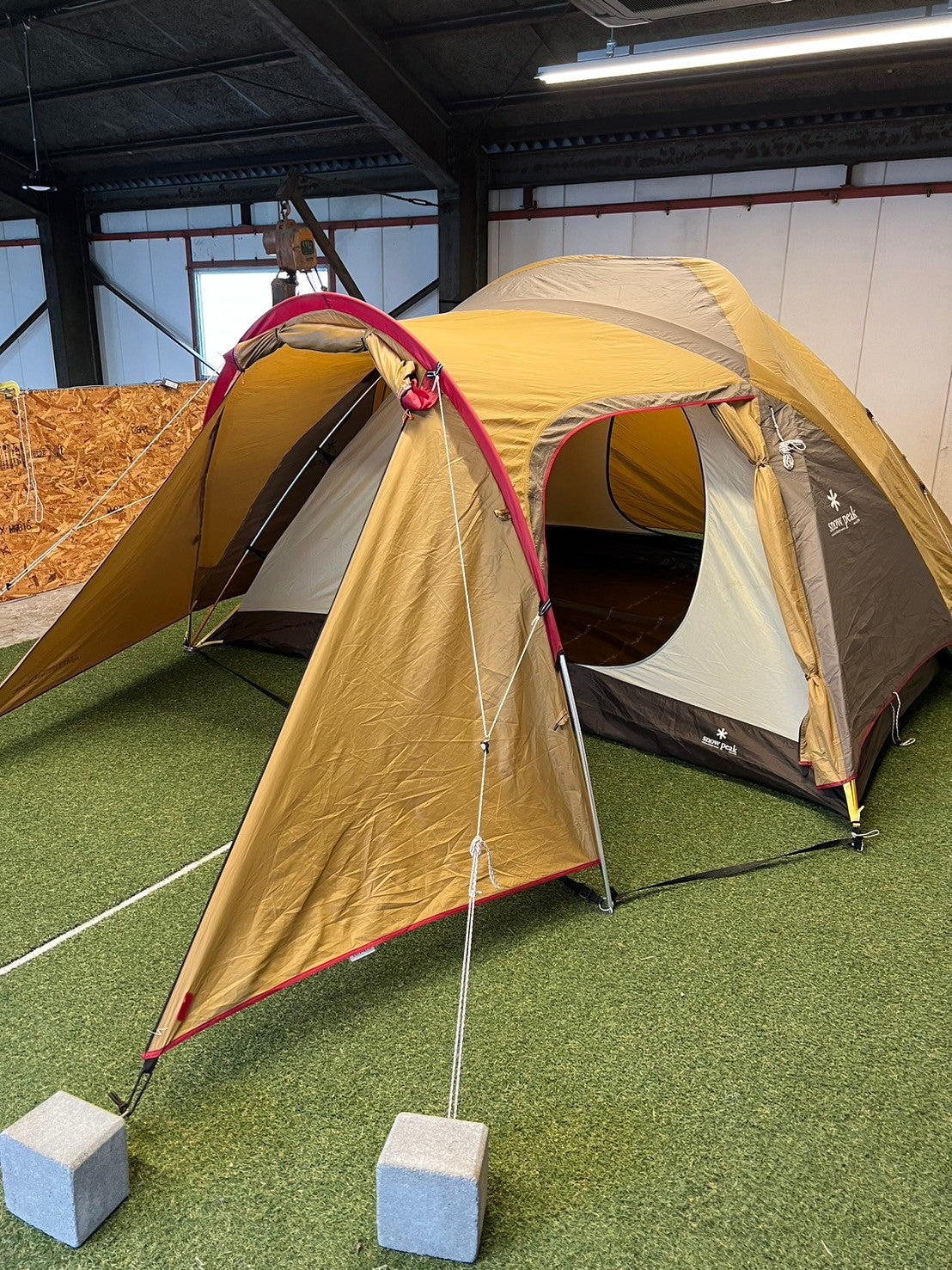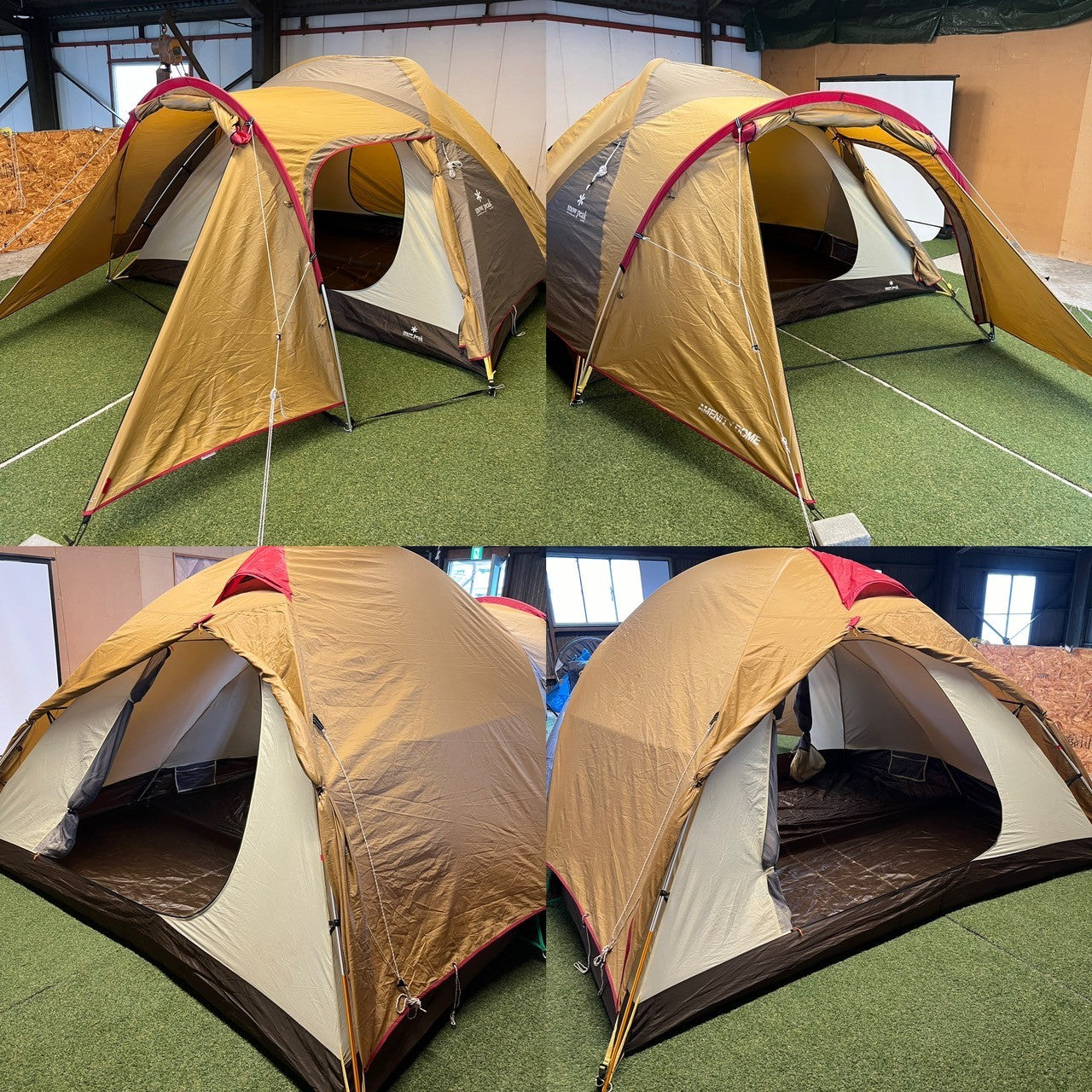 付属品 | 本体用メインフレーム×2、前室用フレーム、インナーテント、フライシート、ロープ×10(テント本体に付属)、フロアシート、取り扱い説明書あり、収納袋 |
